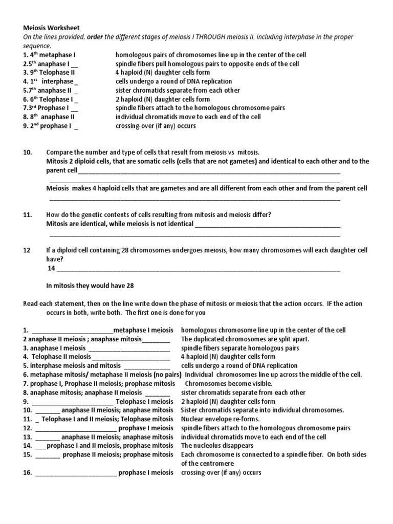 Malicah cain meiosis i worksheet pdf meiosis worksheet answer key meiosis worksheet 1 a cell with two pairs of each set of chromosomes is called a course hero from www.coursehero.com because answering the issues in the worksheet is exactly like learning about. Meiosis is the process of creating new bacteria from old bacteria. Comparing mitosis and meiosis worksheet, mitosis versus meiosis worksheet answers and cell cycle and mitosis worksheet answer key are some main things we will present to you based on the post title. If an organism s haploid number is 6 its diploid number is 3. Identify which phase of meiosis is shown in the diagrams below.